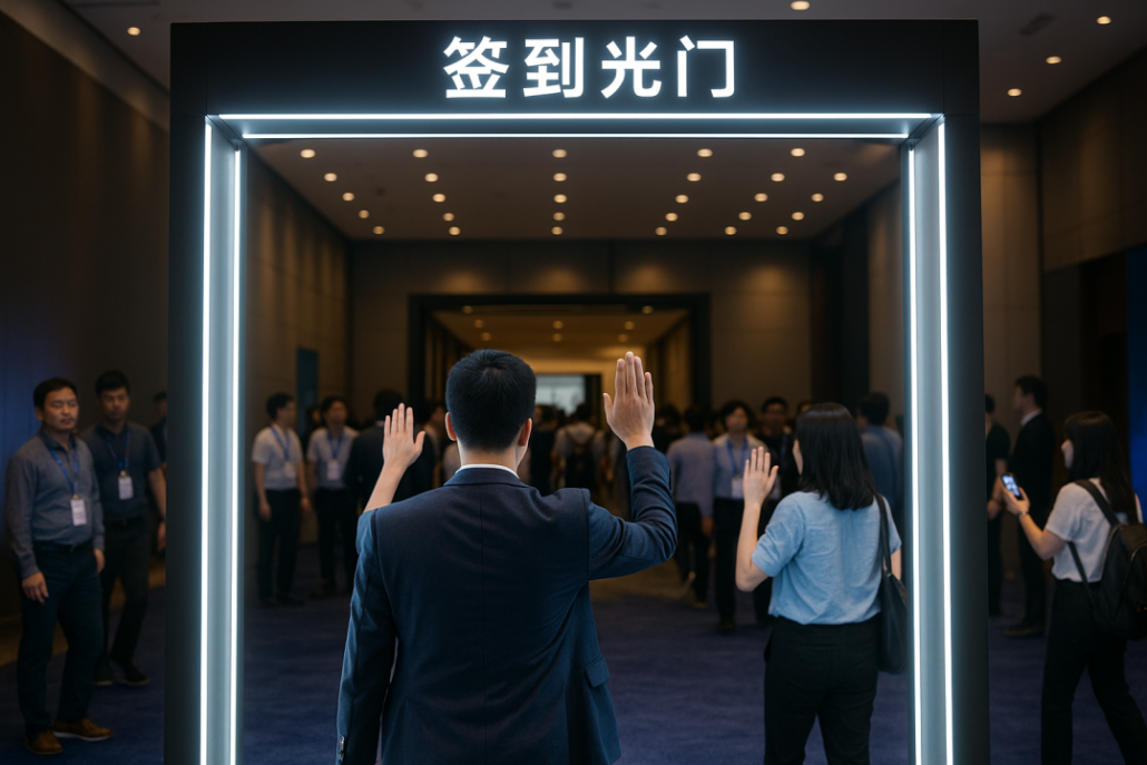 - 玩法:嘉宾抬手 3 秒,光柱追踪签名并同步到会务 CRM。