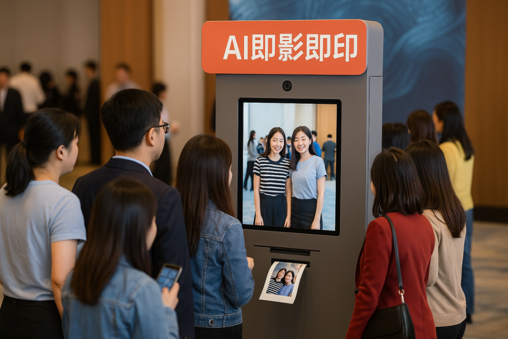 - 玩法:拍照→AI 抠像 + 品牌海报→10 s 打印,生成带二维码分享卡。